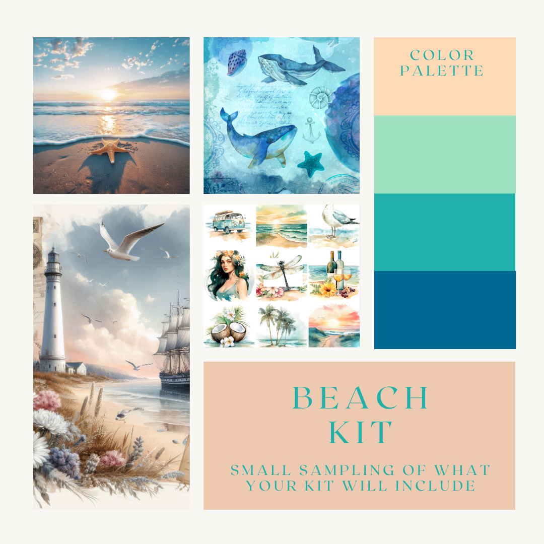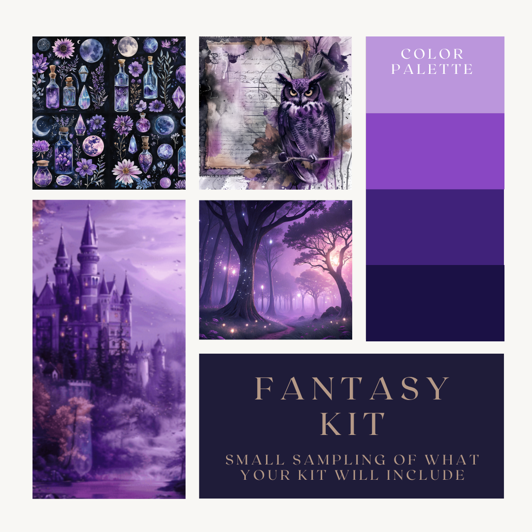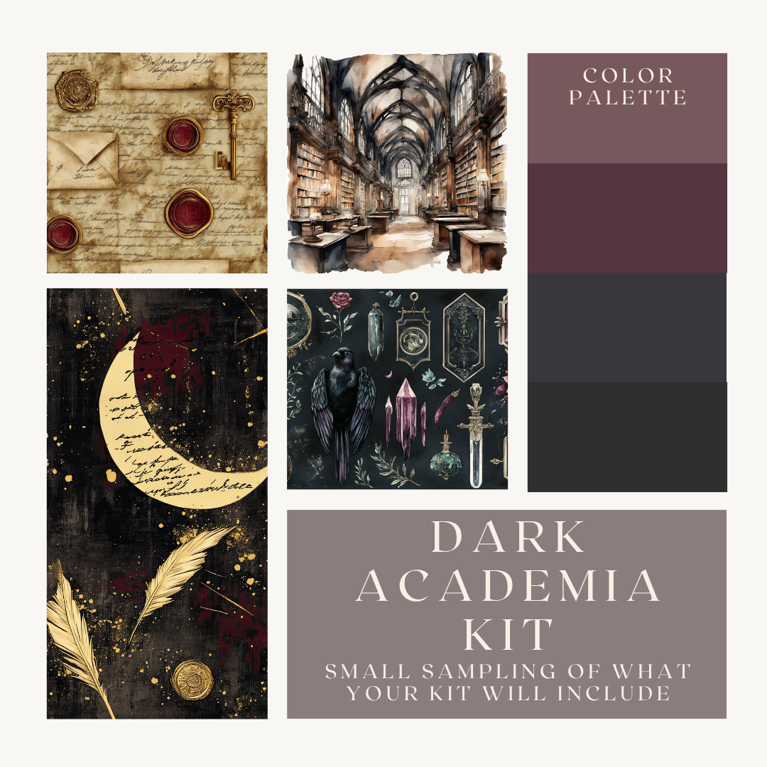 Pick from Fantasy, Woodsy, Floral, Beach, or Dark Academia kits — each filled with papers, stickers, and more.